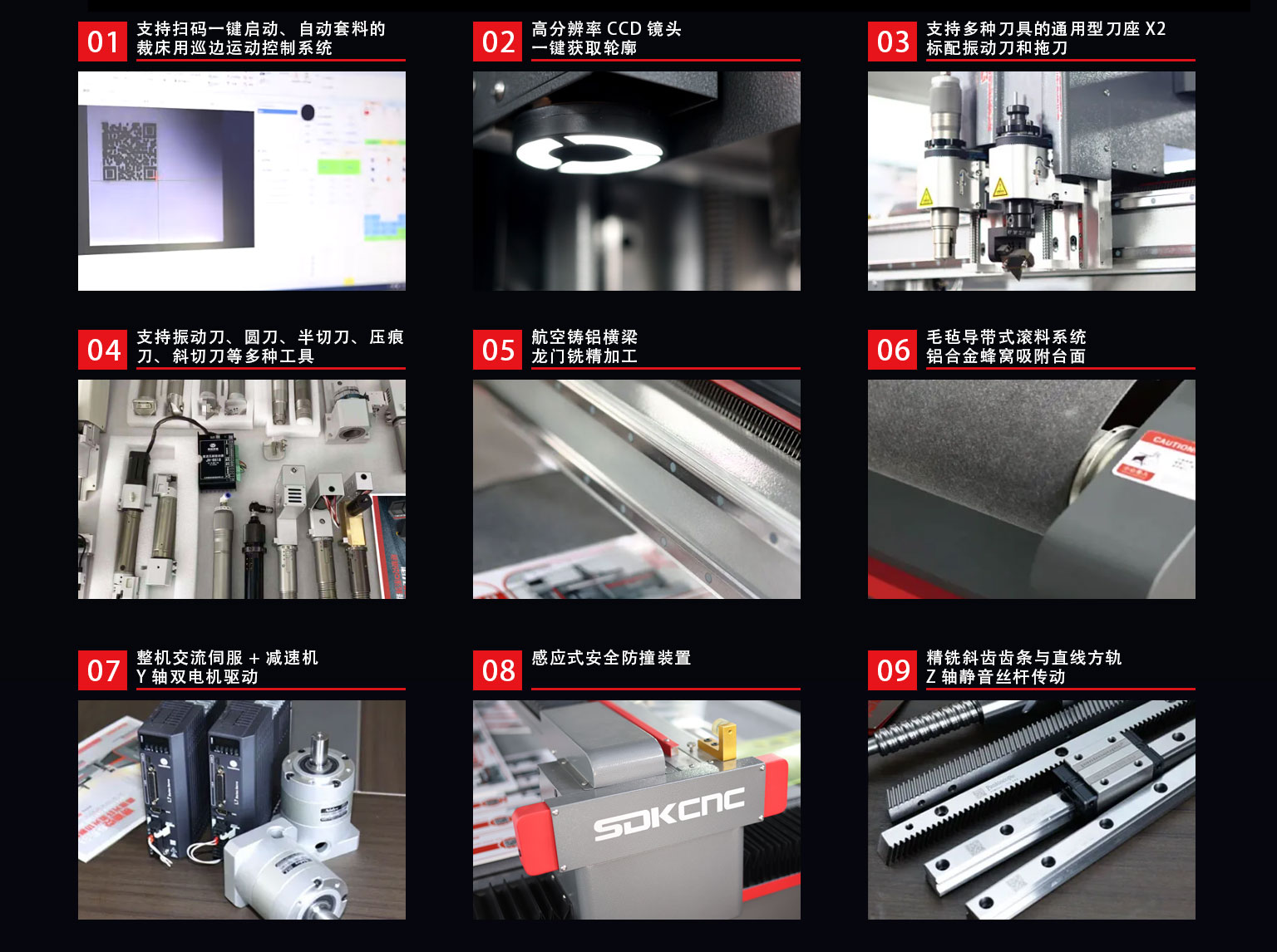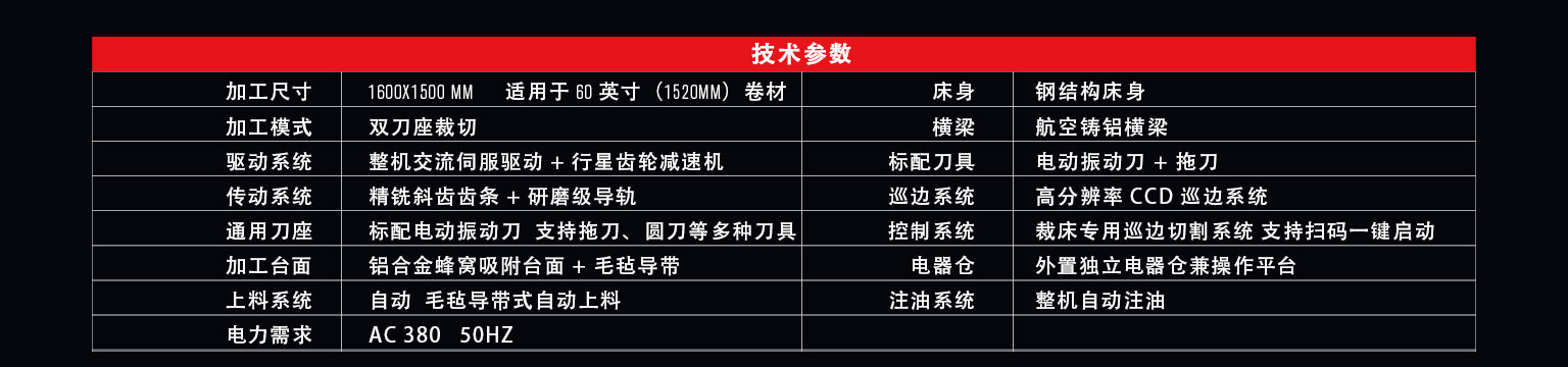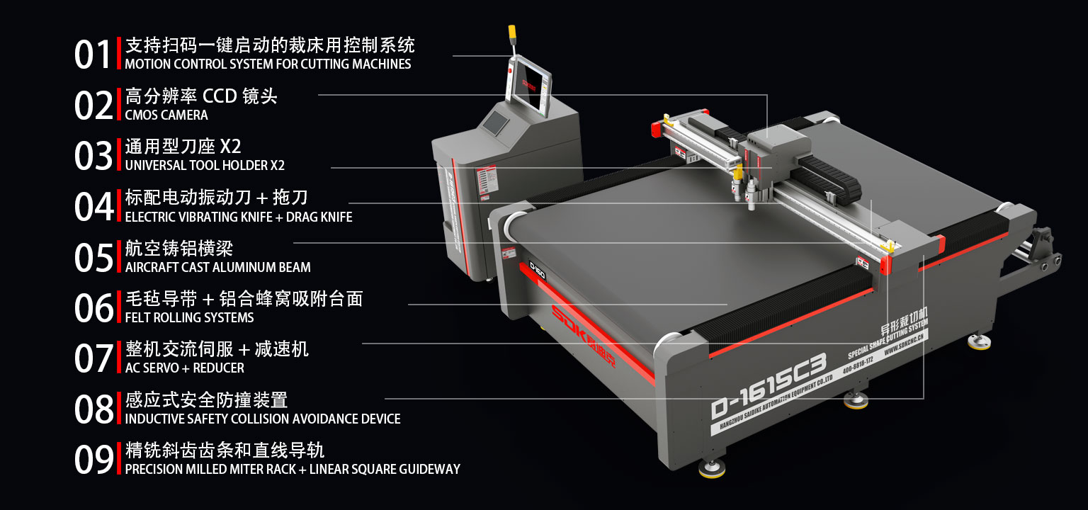 D-1615C3是一款對應柔性卷材的高速異形裁切設備,采用導帶式加工平臺適合超長材料的連續(xù)切割。雙刀座,標配電動振動刀和拖刀,通用型的刀座支持圓刀、寫切刀、壓痕刀等多種刀具。支持掃碼一鍵啟動的裁床用巡邊控制系統(tǒng),可高速完成柔性材料的裁切、半切、壓痕,開槽,沖孔,輪廓識別裁切等多項工藝。